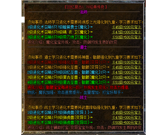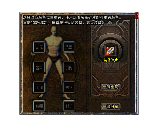 装备介绍:商店货→沃玛→祖玛→赤月套→复古战狂→所有装备暴率都很低,绝不会烂安全区的存在长期养老!